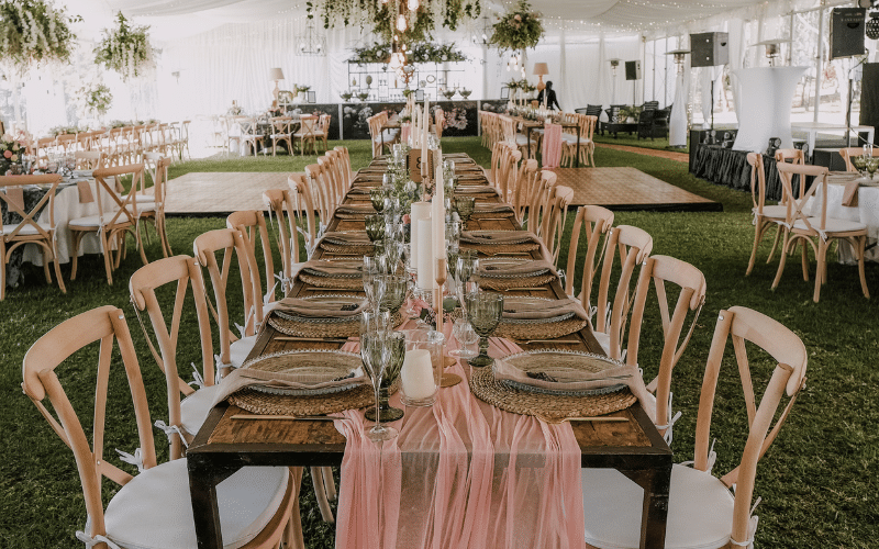 Dekorationerna är avgörande för festens myskänsla. Häng upp ljusslingor längs tältets kanter för ett varmt ljus. Lägg ut filtar och kuddar på stolar eller bänkar så att gästerna håller sig varma under kyligare kvällar. Bord kan dekoreras med enkla blomsterarrangemang eller levande ljus för att ge en personlig touch.